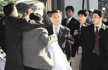 16日,前駐美大使洪錫炫剛到首爾中央地方檢察院大樓,民主勞動党有關人士就舉著“拘留洪錫炫”的條幅,向他撲了過來。圖爲,《中央日報》有關人士抱著該人的脖子,阻止他接近。洪錫炫是《中央日報》的所有者。