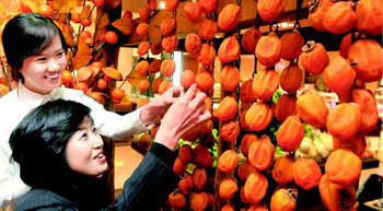 21日,在首爾中區小公洞樂天百貨總店水果櫃檯前,女顧客們正在摸挂在曬架(曬乾柿子的架子)上的慶北上柱山出產的新幹柿子。樂天百貨商店爲了向顧客展示幹柿子的製作過程,在賣場佈置了曬架。