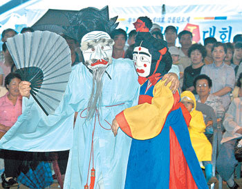 25日,被選爲“聯合國教科文組織口頭和非物質遺産代表作”的江陵端午祭活動之一官奴假面劇。