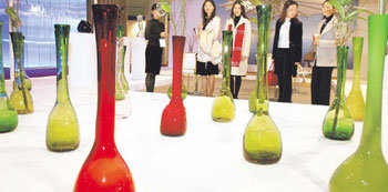 1日,在首爾江南區三成洞韓國國際會展中心舉行的“韓國設計2005”活動上,觀衆們正在觀賞比利時作家朗貝勒(音譯)的玻璃花瓶。上圖爲英國瑪莎百貨展示的便於攜帶的旅行自用電風扇。