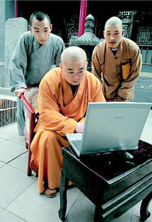 中國少林寺大膽“入世”。少林寺住持釋永信(中)正在用電腦與世界接軌。他說:“如果我們不自己宣傳,誰都不會瞭解我們。”