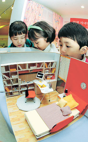 7日,大泉室內裝飾爲紀念兒童房家具上市,在首爾江南區論峴洞賣場舉行了“微型兒童房家具展示會”。圖爲,小朋友們正在觀賞根據100分之1的比率縮小的微型家具。