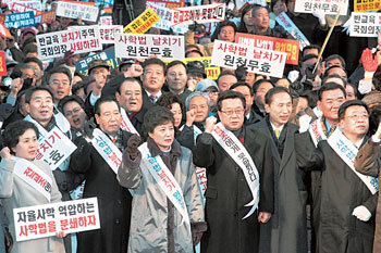 爲抗議強行處理《私立學校法》修正案,16日下午,在首爾市廳前的首爾廣場舉行場外集會的大國家黨代表朴槿惠、所屬議員、私學及家長團體成員們正高喊《私學法》無效的口號。