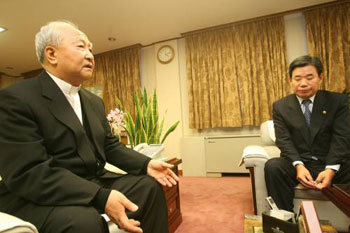 圖爲,19日,天主教首爾大教區負責人鄭鎮奭大主教(左)正在向訪問首爾明洞聖堂主教館的副總理兼教育人力部長官金振杓表明反對私學法修改案的立場。鄭鎮奭稱:“應用市場經濟原理就能解決私學腐敗。”