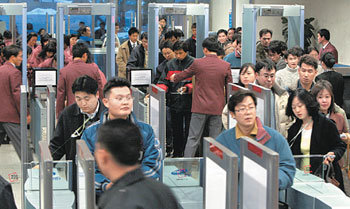 韓國忠南牙山市湯井LCD園區創造出“第2個漢江奇迹”的同時正崛起爲中部圈經濟的新核心基地。圖爲,入駐湯井産業第1園區的三星電子職員在接受嚴格的保安檢查後下班。