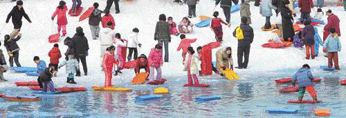 15日,在這個好不容易迎來的溫暖的休日裏,首爾漢江市民公園汝矣島雪橇場內,孩子們正坐著雪橇高興地玩耍。當天中午,首爾最高氣溫達零上7.6度,積雪也開始融化,雪橇到達的地方雖然變成了水地,但孩子們始終玩得很開心。