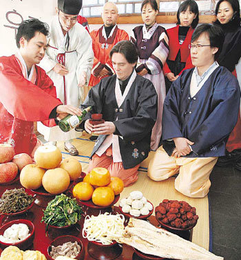 24日,在新年即將到來之際,麹醇堂在首爾仁寺洞餐廳閔家茶軒針對新婚夫婦和居住在國內的外國人夫婦展開了體驗韓國供桌文化的活動。成均館祭禮研究委員會副委員長黃義旭(音)正在介紹正確的供桌禮節、供桌食品的含義、飲用供桌酒的方法等。