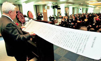 광복회가 주관하고 삼균학회가 주최한 대한독립선언 선포 제87주년 기념식이 1일 서울 중구 태평로 한국프레스센터 19층 기자회견장에서 열렸다. 조만제 삼균학회장이 대한독립선언서를 낭독하고 있다.