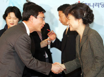 16日,保健福利部長官柳時敏(左)新上任後訪問國會大國家黨代表室,正彎腰與朴槿惠代表握手。兩人就國民年金改革問題進行了短暫的對話,柳時敏還拿出筆記,記錄了朴槿惠的講話內容。
