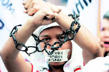 8日,爲迎接世界女性的節日,在菲律賓馬尼拉的美國大使館附近,用鐵鏈綁住雙手並在嘴上貼上膠帶的一位女性正在展開示威。膠帶上用當地文字寫著“壓迫,壓制”。當天示威隊主張保護女性人權,並反對美國和菲律賓的年例聯合軍事演習。