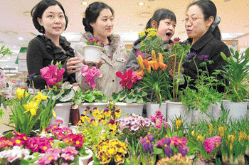 購買迎春的迷你花盆如何。14日,來到現代百貨商店木洞店的顧客,正在挑選迎接春天用於裝飾房間的迷你花盆。花盆單價爲1萬∼5萬韓元。