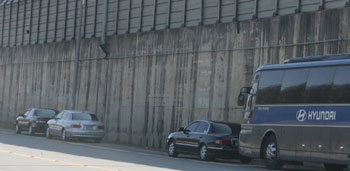 30日,起亞汽車總經理鄭義宣乘坐的歐菲萊斯轎車(左數第2個)和公司相關人士的車停在了首爾瑞草區良才洞清溪山登山路周邊的國道邊上。原本在轎車內的鄭義宣看到本報攝影記者在拍照,快速避到別的地方。