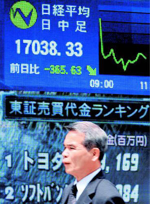 24日上午,一位公司職員正從日本東京中心街顯示股指的電子大螢幕前經過。當天日經平均指數因受日元兌美元匯率下滑和高油價、心理上不安感等因素的影響,比上周末急劇下滑2.81%,以16915.4日元收盤。