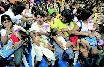 4日,菲律賓馬尼拉有3738名母親同時給孩子喂母乳,創下了新的吉尼斯世界記錄。這遠遠超過了2002年在美國加利福尼亞,1130名女性喂母乳的前記錄。此次活動由菲律賓保健部和母乳哺乳運動團體主辦,活動的宗旨是,讓菲律賓低收入層女性瞭解母乳對孩子和産婦健康的重要性。