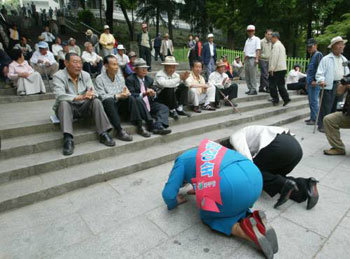 5·31地方選舉正式選舉運動開始的18日,一名候選人在光州南區社稷洞光州公園裏展開街頭遊說活動,他正在給一位有權投票的老人鞠躬。