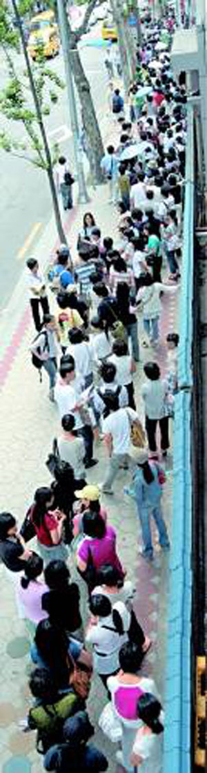 9日下午,報考7、8月託福考試的考生們在首爾麻浦區韓美教育委員會排起了長隊。託福考試將從9月開始由現行的CBT(Computer-based Testing,電腦測驗)方式改爲通過互聯網進行的IBT(Internet-based Testing,網路測驗)。有分析說,新方式增加了口試,因此對韓國考生不利。