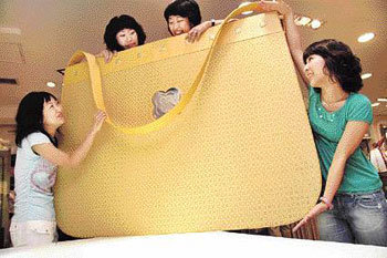 樂天百貨店首爾中區小公洞總店將到15日爲止舉行特色女包展。該店將展示長寬2.5米的超大型皮包(左)和手掌大小的迷你皮包。