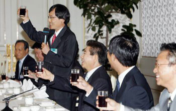12日,應韓國總統盧武鉉的邀請,在青瓦台和因特網門戶網站代表們舉行的午餐座談會上,SK通訊代表俞賢午(站立者)正提議乾杯。