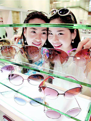 隨著夏季闊步向我們走來,具有不同樣式和功能的墨鏡紛紛上市。18日下午,在首爾中區小公洞樂天百貨店賣場,女顧客們正在挑選墨鏡。