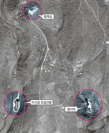 圖爲,出現北韓準備試射大浦洞二號或大浦洞二號改良型導彈的徵兆的鹹鏡北道花台郡舞水端裏的導彈發射基地。這是空間影像公司1999年發射成功的IKONOS衛星拍攝的照片。照片上清楚地呈現出發射台、導彈組裝建築和控制室等基地內的設施。