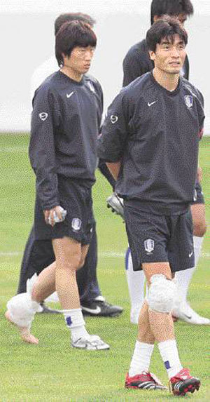 반드시 알프스를 넘는다. 2006 독일 월드컵 G조 조별리그에서 19일(한국 시간) 스위스가 토고에 2-0으로 이기면서 한국은 24일 열리는 스위스전에서 승리해야 16강 진출을 확신할 수 있게 됐다. 한국축구대표팀이 20일 레버쿠젠 바이아레나에서 회복 훈련을 마치고 경기장을 나서고 있다. 얼음찜질을 하고 있는 박지성(왼쪽)과 최진철의 다리가 보인다.