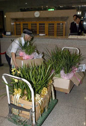 20日新選出的第17屆國會後半期國會議長團及常任委員長們,在首爾汝矣島國會議員會館收到了有關團體送來的很多花籃。21日,一家花店的送貨員在議員會館入口爲了給各議員室辦理送貨手續,正將花籃放下來。