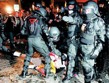 20日,德國警方在科隆市中央廣場正在逮捕足球流氓。科隆市警察當局當天發表說,共逮捕了在世界盃B組英格蘭隊與瑞典隊比賽前後引發騷亂的22名英國足球流氓和30多名德國足球流氓。當天英格蘭隊和瑞典隊2比2戰平。