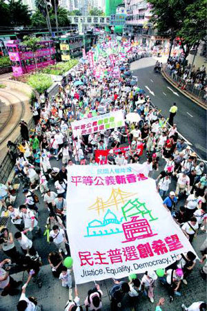 在香港回歸中國9周年的1日,1萬多名香港市民在香港中心大街維多利亞公園附近舉行示威,要求實行行政長官自選制。當地媒體報道說,在全香港共有5.8萬多名市民參加了當天的示威。