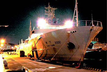 預計從3日開始對獨島周邊海域進行海流勘測的國立海洋調查院“海洋2000號”於上月30日夜晚在嚴密的保安下抵達釜山港監灣(音)市民碼頭。圖爲,正在進行勘測前的最後一次檢查。