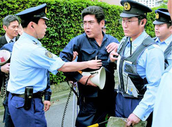 6日,日本的一個右翼團體成員(中)在東京的旅日朝鮮人總聯合會(朝總聯)中央本部前舉行示威時,受到日本警察的制止。當天,右翼團體在朝總聯中央本部周圍紛紛舉行示威,就北韓發射導彈提出抗議。