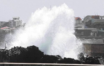 9日,濟州地區進入了伴隨強風的今年第三號颱風“艾雲尼”的影響圈內。圖中可見,在西歸浦市法還洞浦口,足有一幢房子大的海浪在猛烈撞擊防潮堤。