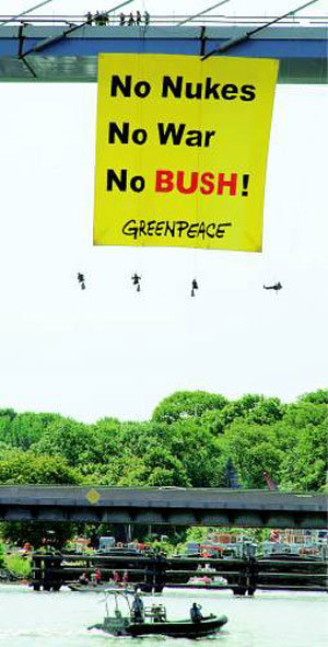 環境團體——綠地和平組織的成員們13日在德國北部斯特拉爾松市的一個橋上懸挂了寫有“反核,反戰,反布希”的大型條幅。這針對的是在德國總理安格拉·默克爾的政治故鄉——斯特拉爾松舉行德-美首腦會談的美國總統喬治W布希。布希15日將前往俄羅斯參加G8會談。