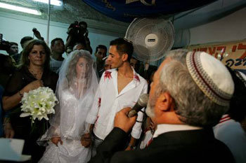 隨著黎巴嫩事態的惡化,以色列和黎巴嫩國民的生活變得越來越不安。20日,在以色列北部極列特休謨納(音譯)的防空洞中,一對情侶正在舉行婚禮。該地區居民直到當局下達指示爲止,要一直在防空洞中生活。