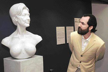 圖爲,9日,美國雕塑大師丹尼爾·艾德沃茲正在介紹在紐約性博物館展示的作品。作品的名稱爲《美國第一位女總統希拉裏·克林頓半身像》。他說:“不久前,女演員莎朗·斯通說,‘希拉裏女士因爲性感,不能成爲總統。’這刺激了我,所以製作了裸胸像。”