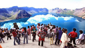 白頭山天池上空萬里無雲。8月中旬到下旬是遊覽白頭山天池的最佳時機。因爲這個時候不可捉摸的白頭山天池的天氣也會放晴。攝於18日。