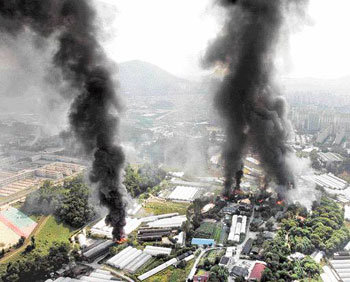 26日下午,在京畿果川市和儀旺市交界地區——清溪山附近的塑膠大棚園區,升起了巨大的煙霧。當天因果川市和儀旺市地區的高壓線路多處被火燒斷,這一帶的塑膠大棚和住宅、山林等地同時發生了火災。