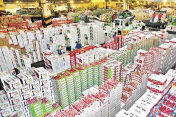 面臨中秋佳節,27日在首爾松坡區可樂洞的青果市場裏,職員們正在爲搬運水果箱子而忙碌。當天淩晨,來自全國各地的蘋果、梨等堆積如山。