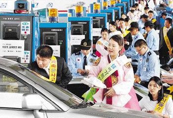 距離中秋節還有2天的4日,在京畿城南市盆唐區宮內洞京釜高速公路首爾收費站,諸多企業在這裏展開了激烈的市場銷售競爭。當天,現代海上火災保險公司、Meritz火災保險公司等10多家企業的職員給車輛的司機遞接水、垃圾袋和報紙等物品。