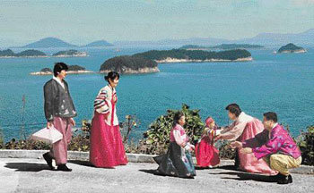 思念故鄉,長途跋涉400多公里去看望父母。在臨近中秋的4日,住在首爾的徐廷旭(35歲,保險設計師)帶上兩個女兒知賢(4歲)和民在(2歲)和妻子鄭恩實(29歲)一起去看望住在慶南統營市欲知面東恒裏的父母。圖爲,滿面笑容地跑向爺爺奶奶懷中的孩子們。湛藍的秋日天空和藍色的大海也同這個家庭一起露出了燦爛的笑容。(人名均音譯)