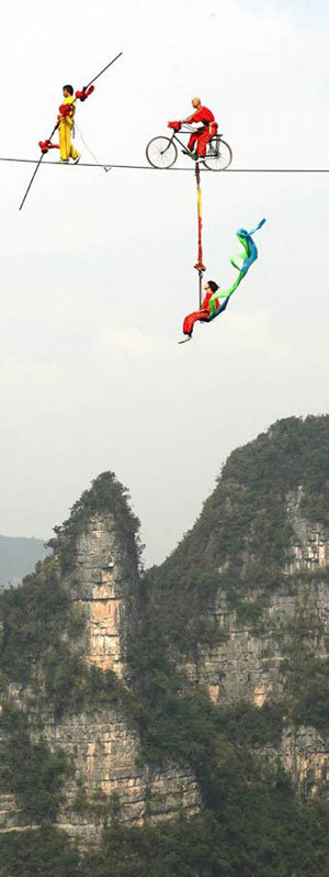 9日,在河北省五鳳(音譯),中國的3名特技師正在展現高空走鋼絲絕技。爲了吸引遊客的眼球,在距離地面有1800米高的山頂兩處連接了鋼絲。