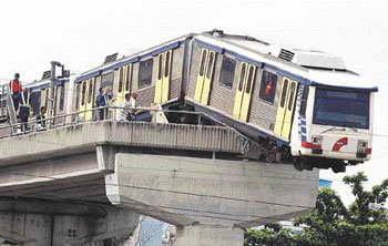 27日,在馬來西亞吉隆坡,脫軌的火車懸停在高架橋頂端,情況十分危險。人員死傷情況目前還沒有報道。