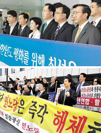 민주노동당 당직자가 포함된 386 운동권 출신 간첩단 의혹 사건 도중에 민노당 지도부가 30일 방북 길에 올라 논란이 격화되고 있다. 민노당 노회찬 의원, 문성현 대표, 권영길 의원 등 방북단(위)이 인천공항에서 방북 출발을 기다리는 동안 서울 여의도 민노당사 앞에서는 뉴라이트시민연합 회원들이 민노당 비판 시위를 벌였다(아래).