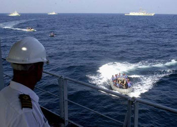 30日(當地時間),大規模殺傷性武器防擴散安全倡議(PSI)海上攔截演習在巴林東北方向的海灣公海進行,參加演習的巴林和美國士兵完成對可疑船隻貨物搜查任務後,正在回到艦艇上。此次演習是自2003年PSI體制出臺以後的第25次,在10月30和31日進行。
