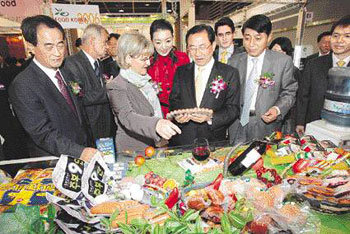 1日,展示世界各國農產品和傳統食品的首爾國際食品展在首爾瑞草區良才洞AT中心舉行。圖爲,農林部次官補樸海相(前排中)正在外國食品展位聽取說明。展會將舉行到4日。