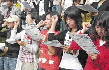 由於明年度教師聘用名額大幅減少,全國師範大學的學生們接連罷課,在校園內舉行示威。圖爲,1日參加“爲拒絕雇用和無限期拒絕學士的總動員鬥爭宣言大會”的師範大學生們正在喊口號。該大會由釜山師範大學總學生會發起。