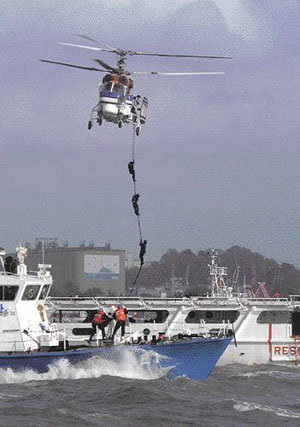 8日下午,在仁川海警船專用碼頭防波堤前海,海洋警察廳和消防防災廳海軍等6個機關的486人進行了2006恐怖襲擊應對演習。