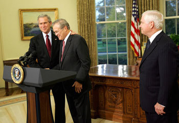 也許乾脆離開會感到更輕鬆。離開的美國國防部長唐納德·拉姆斯菲爾德(中)和宣佈他辭職的美國總統布希的表情都透露出些許苦澀,但仍極力保持微笑。這與似乎擔憂朝弱野強的艱難環境,帶著嚴肅表情的國防部長內定者羅伯特·蓋茨形成了鮮明對比。隨著布希於8日毫無預兆地宣佈拉姆斯菲爾德辭職,包括伊拉克戰爭在內的美國對外政策迴旋的可能性進一步增大。