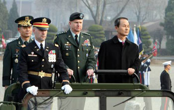 13日,在首爾龍山區韓美聯合司令部夜間野外練兵場舉行的國防部長官金章洙歡迎儀仗活動中,金章洙與韓美聯合司令部司令官、駐韓美軍司令官貝爾一同檢閱儀仗隊。