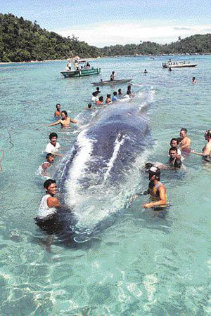 圖爲,15日,在馬來西亞哥打京那巴魯沿岸的一個小島,居民們團團圍住體長24米的布氏鯨。布氏鯨是世界上禁止捕撈的瀕危物種。當時這頭布氏鯨因在淺水海岸擱淺而無法動彈。馬來西亞當局當天動用幾艘船,將鯨魚送回了東中國領海的深海區。