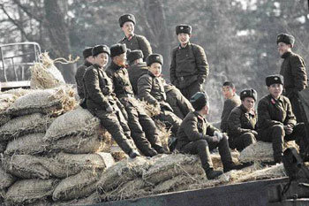 16日,在鴨綠江上,北韓軍人坐在載有稻草袋子的船上。他們可能是爲了把稻穀轉移到脫穀場所而參加運輸工作的軍人。他們都穿著兩三年才發放一次的新冬季軍裝,帶著士官學校的肩章。北韓軍隊士官學校是從士兵晉升爲軍士的學校。